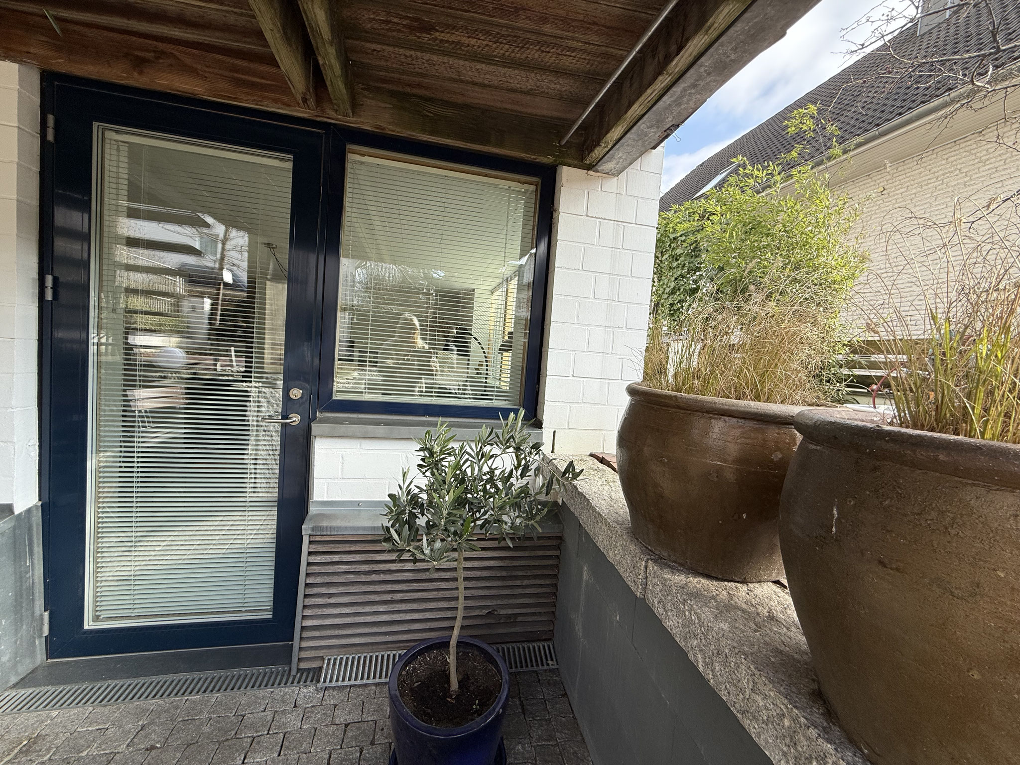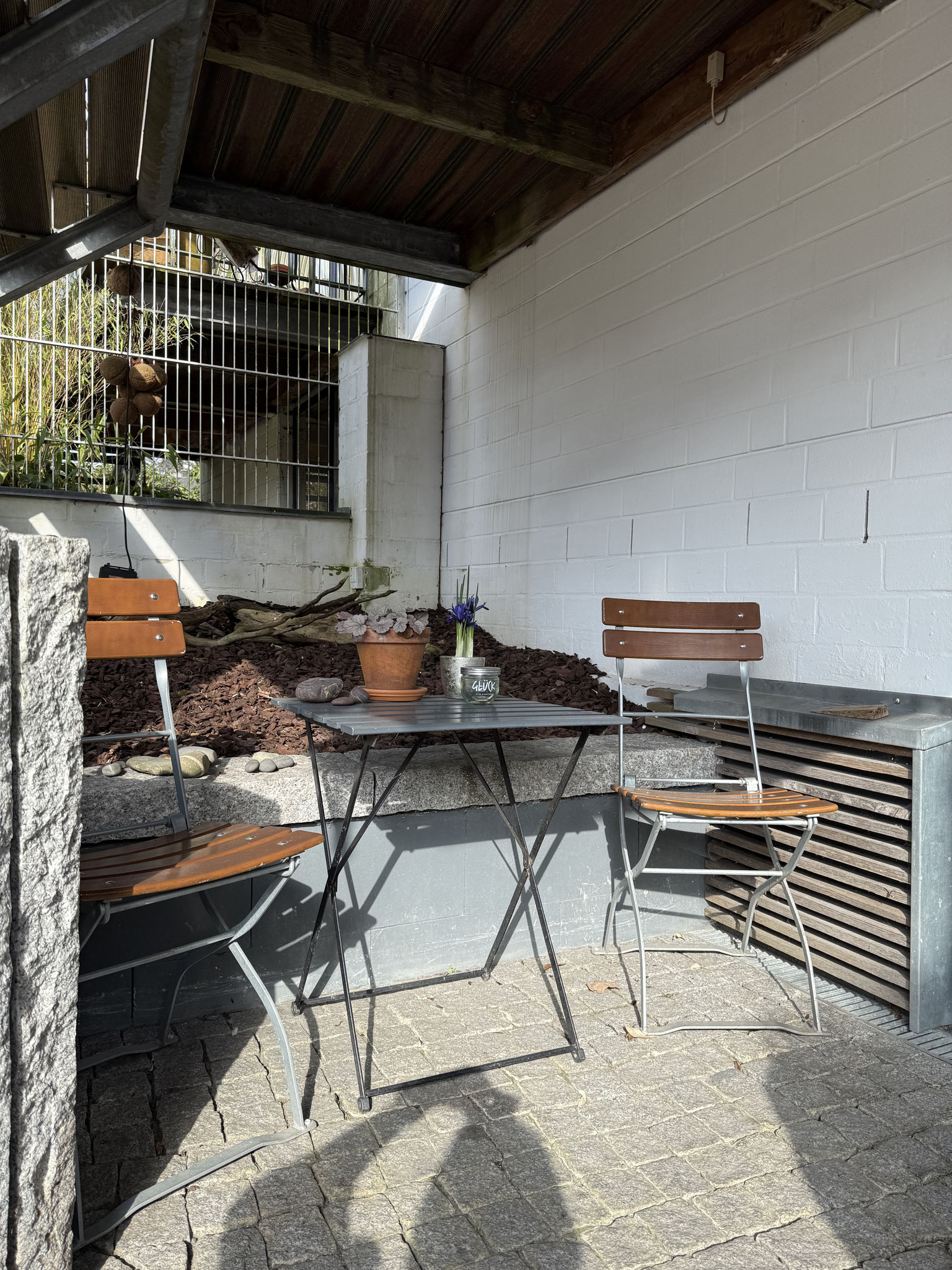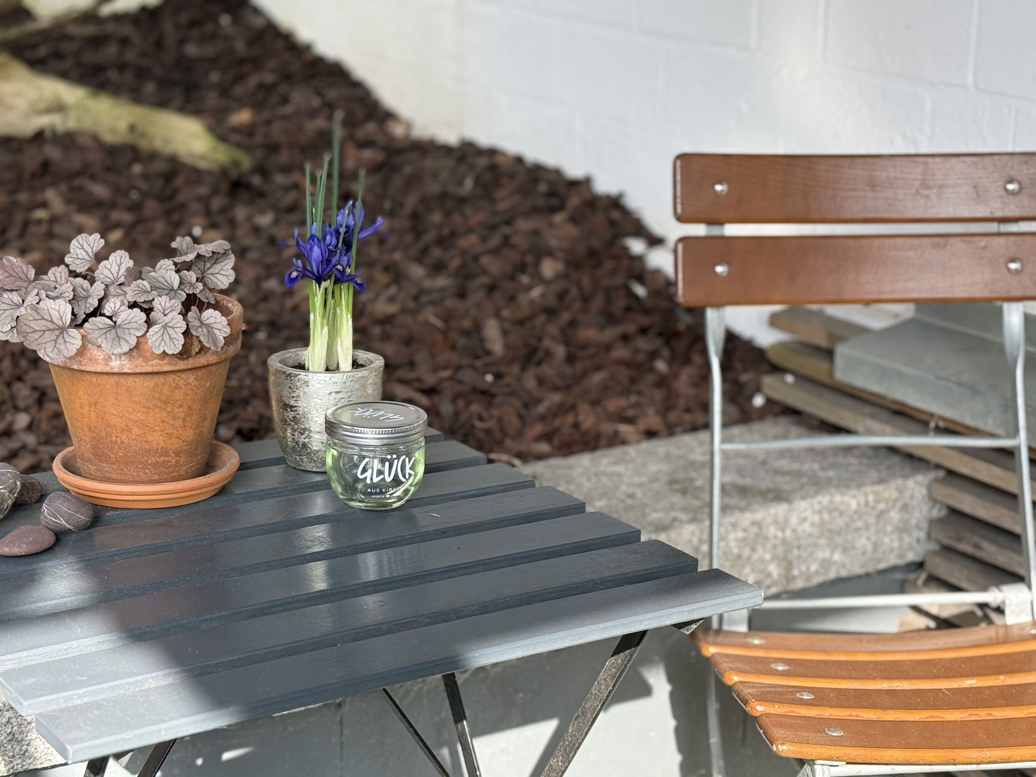 Terrasse: 6 qm; südwestliche Ausrichtung, Tisch mit zwei Stühlen